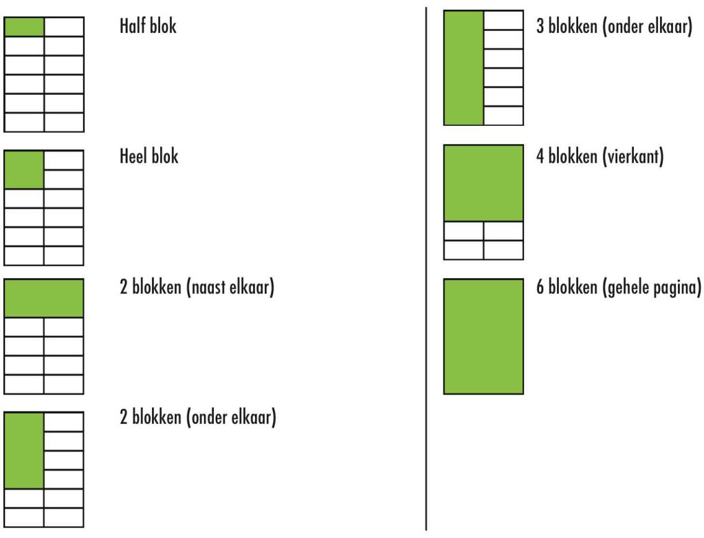 6 blokken (gehele pagina) 142 mm breed x 204 mm hoog of een bestaande flyer